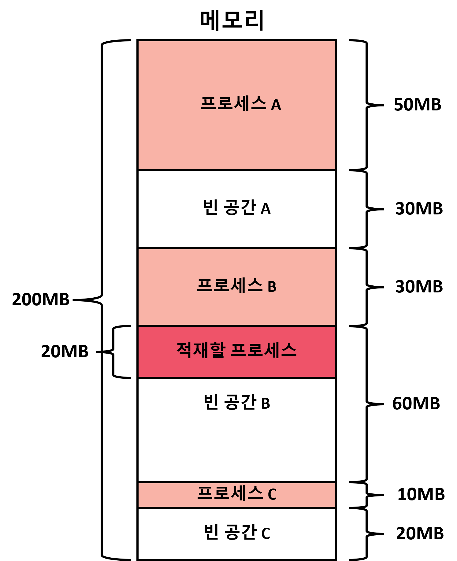 - 최악 적합: 프로세스가 적재될 수 있는 가장 큰 공간에 프로세스를 배치하는 방식