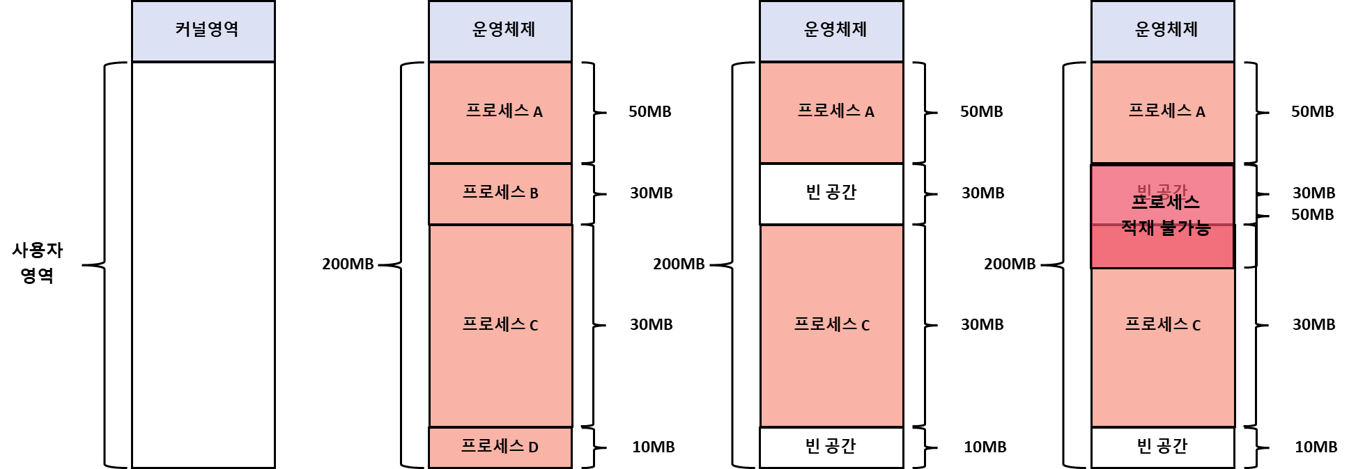 외부 단편화: 메모리 내 공간이 남아있지만 프로세스를 할당하기 어려울 만큼 작은 공간으로 남아있어 용량이 큰 프로세스를 적재하기 어려운 상황을 초래하여 메모리가 낭비되는 현상